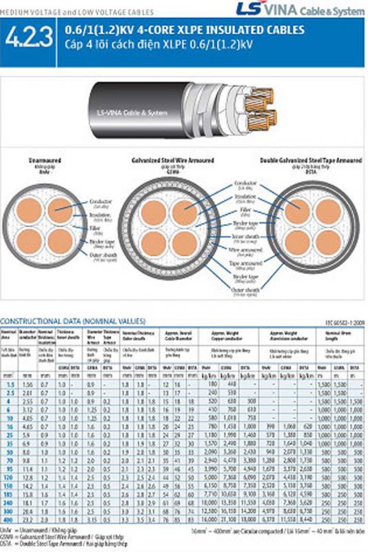 1. Thông số kỹ thuật cáp 0,6/1kV loại 4 lõi cách điện XLPE hãng LS-ViNa