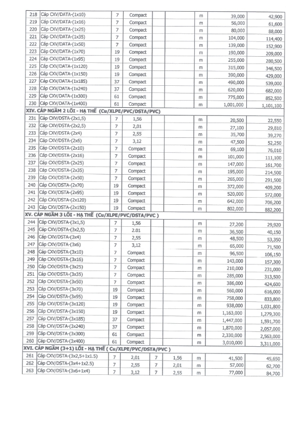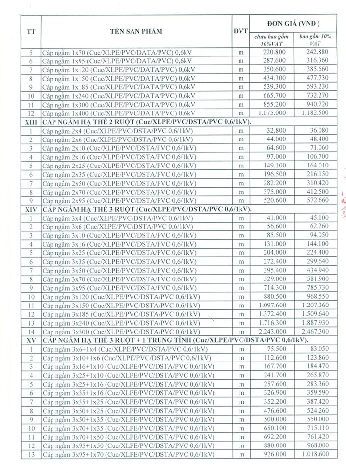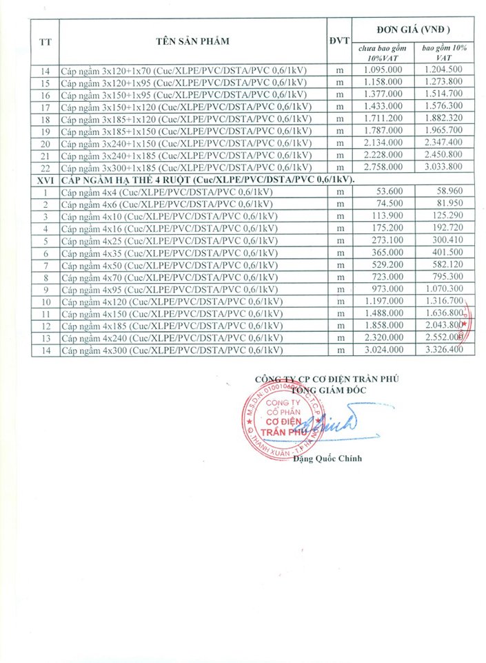 Bảng giá cáp điện ngầm Trần Phú