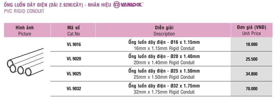 Ống luồn dây điện tròn cứng Vanlock D16 - VL9016 (độ dài 2.92m / cây)